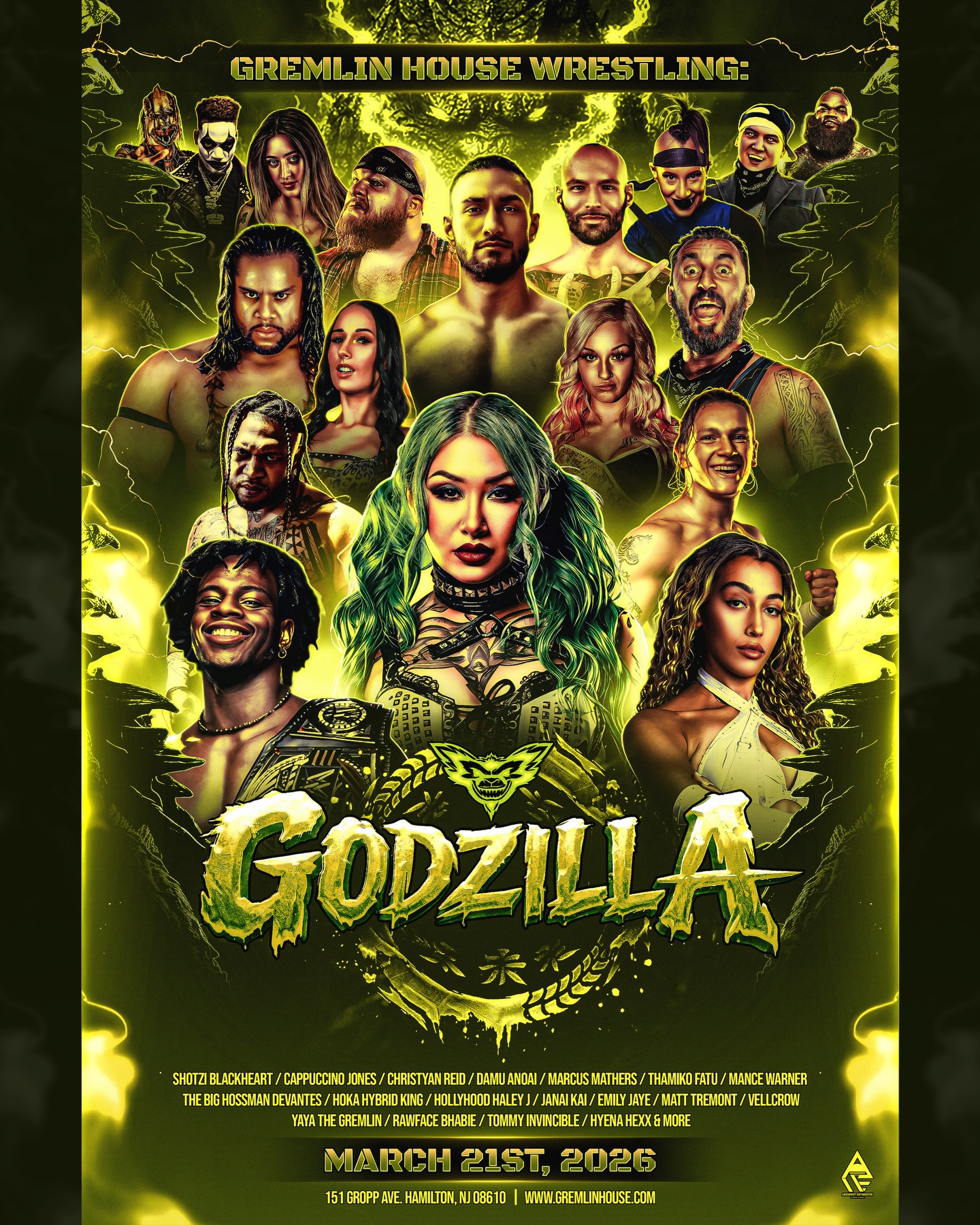 Gremlin House Wrestling presents: GODZILLAZ❗️SATURDAY MARCH 21st 2026❗️Live Professional Wrestling at St Raphael’s in Hamilton NJ❗️This event is Kid Friendly and has a HUGE PARKINGLOT❗️Children must be accompanied by an adult. 6pm doors 🚪 7pm Belltime 🔔 ❗️FRONT ROW SOLD OUT❗️